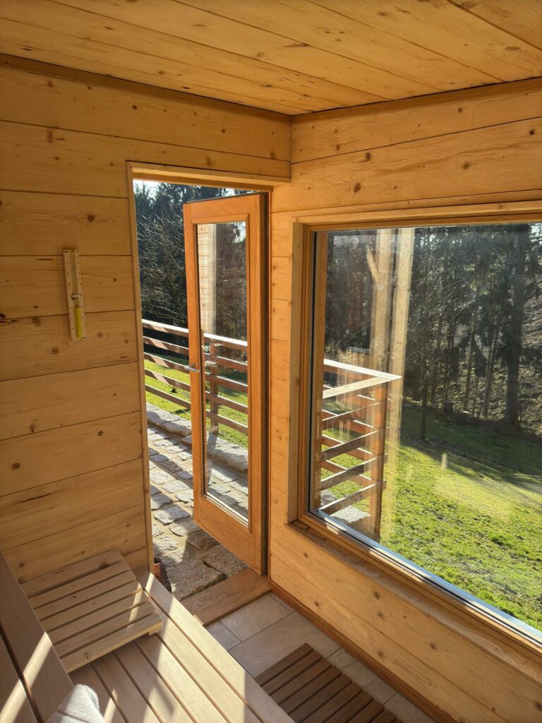 In der Sauna könnt ihr richtig ins Schwitzen kommen, und euch anschließend mit der Panorama-Aussendusche abkühlen. (Warmwasser)